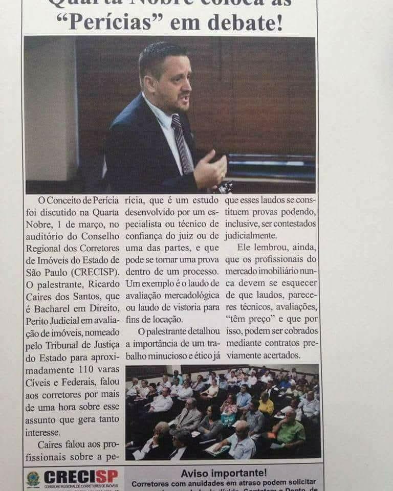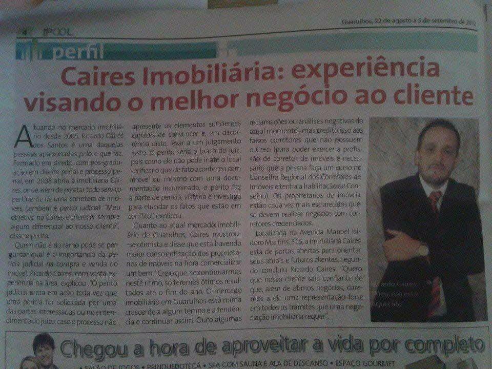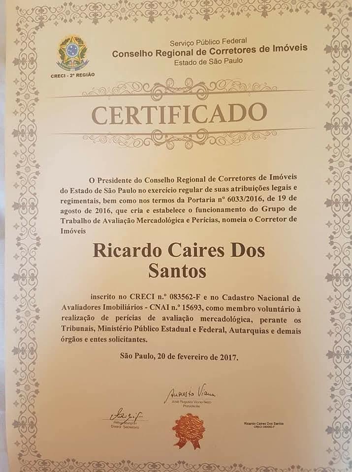 Ricardo Caires dos Santos é o corretor de imóveis responsável pela Consultório Imobiliária, Perito Avaliador Judicial e Delegado Distrital em Guarulhos – CRECI/SP, além de CEO do Laboratório Científico Ricardo Caires Ltda.